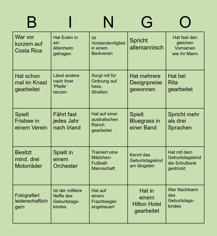 This bingo card has a free space and 24 words: Fotografiert leidenschaftlich gern, Spielt in einem Orchester, Sorgt mit für Ordnung auf hess. Straßen, Hat in einem Hilton Hotel gearbeitet, Hat fast den gleichen Vornamen wie ihr Mann, War vor kurzem auf Costa Rica, Hat Eulen in ein Altenheim getragen, Ist Vorstandsmitglied in einem Backverein, Spielt Bluegrass in einer Band, Spricht mehr als drei Sprachen, Spielt Frisbee in einem Verein, Lässt andere nach ihrer 'Pfeife' tanzen, Kennt das Geburtstagskind am längsten, Hat mit dem Geburtstagskind die Schulbank gedrückt, Hat schon mal im Knast gearbeitet, Ist der mittlere Neffe des Geburtstags- kindes, Hat auf einem Frachtsegler angeheuert, Spricht allemannisch, Hat bei Rita gearbeitet, Besitzt mind. drei Motorräder, Fährt fast jedes Jahr nach Irland, Trainiert eine Mädchen- Fußball- Mannschaft, Hat mehrere Designpreise gewonnen and War Nachbarin des Geburtstags- kindes.