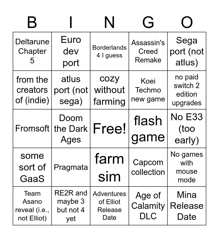 This bingo card has a free space and 24 words: Pragmata, RE2R and maybe 3 but not 4 yet, cozy without farming, Team Asano reveal (i.e., not Elliot), Sega port (not atlus), Deltarune Chapter 5, from the creators of (indie), Euro dev port, flash game, farm sim, Koei Techmo new game, Fromsoft, Capcom collection, No games with mouse mode, atlus port (not sega), Age of Calamity DLC, No E33 (too early), Borderlands 4 I guess, no paid switch 2 edition upgrades, Doom the Dark Ages, Mina Release Date, some sort of GaaS, Assassin's Creed Remake and Adventures of Elliot Release Date.