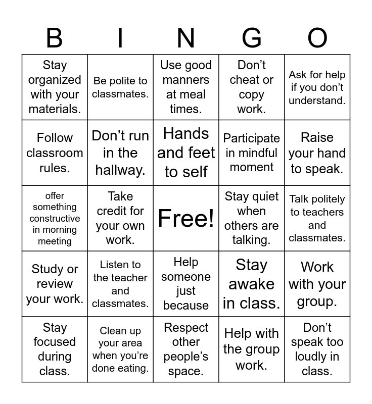 This bingo card has a free space and 25 words: Listen to the teacher and classmates., Respect other people’s space., Hands and feet to self, Stay focused during class., Ask for help if you don’t understand., Stay organized with your materials., Follow classroom rules., Be polite to classmates., Stay quiet when others are talking., Help someone just because, Participate in mindful moment, offer something constructive in morning meeting, Stay awake in class., Work with your group., Don’t run in the hallway., Be honest with your work., Talk politely to teachers and classmates., Use good manners at meal times., Raise your hand to speak., Take credit for your own work., Don’t speak too loudly in class., Clean up your area when you’re done eating., Study or review your work., Don’t cheat or copy work. and Help with the group work..