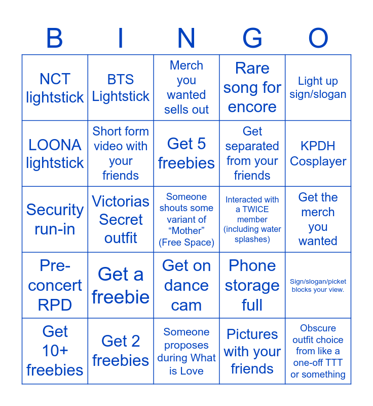 This bingo card has a free space and 24 words: Get a freebie, Get 2 freebies, Get 5 freebies, Get 10+ freebies, Light up sign/slogan, NCT lightstick, LOONA lightstick, BTS Lightstick, Interacted with a TWICE member (including water splashes), Get on dance cam, Get separated from your friends, Security run-in, Phone storage full, Sign/slogan/picket blocks your view., Short form video with your friends, Pictures with your friends, Get the merch you wanted, Merch you wanted sells out, KPDH Cosplayer, Victorias Secret outfit, Obscure outfit choice from like a one-off TTT or something, Pre-concert RPD, Rare song for encore and Someone proposes during What is Love.