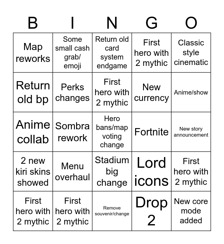 This bingo card has 30 words: First hero with 2 mythic, Add more heroes per year 4+, Sombra rework, One hero switches roles, Map reworks, Return old card system endgame, Perks changes, Stadium big change, Fortnite, Remove souvenir/change, New story announcement, Hero bans/map voting change, Drop 2, New core mode added, Anime/show, Mobile game, Lord icons, 2 new kiri skins showed, Menu overhaul, Classic style cinematic, Anime collab, 6v6 comp role q, Some small cash grab/ emoji, New currency, Return old bp, First hero with 2 mythic, First hero with 2 mythic, First hero with 2 mythic, First hero with 2 mythic and First hero with 2 mythic.