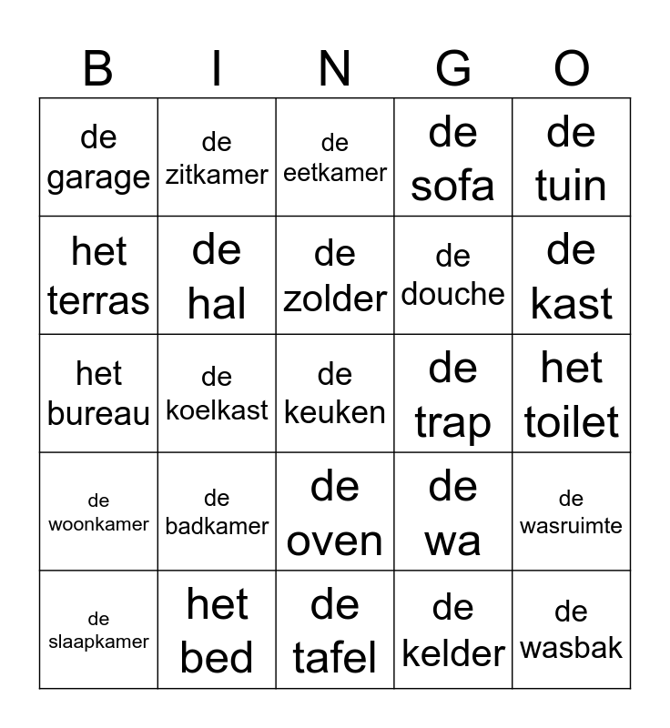 This bingo card has a free space and 24 words: de slaapkamer, de badkamer, de zolder, de kelder, de tuin, de garage, de zitkamer, de eetkamer, de trap, het toilet, het bureau, de hal, de wa, de wasruimte, het terras, het bed, de tafel, de sofa, de kast, de woonkamer, de koelkast, de oven, de douche and de wasbak.