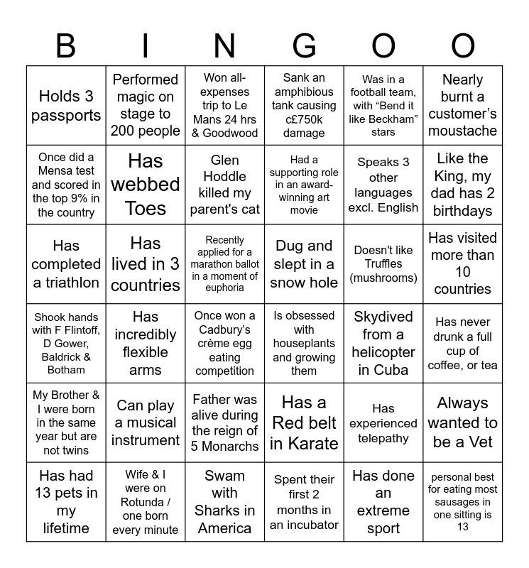 This bingo card has 36 words: Has a Red belt in Karate, Father was alive during the reign of 5 Monarchs, Spent their first 2 months in an incubator, Once did a Mensa test and scored in the top 9% in the country, Shook hands with F Flintoff, D Gower, Baldrick & Botham, Dug and slept in a snow hole, Has webbed Toes, Swam with Sharks in America, Was in a football team, with “Bend it like Beckham” stars, Has experienced telepathy, Like the King, my dad has 2 birthdays, Sank an amphibious tank causing c£750k damage, Always wanted to be a Vet, Has lived in 3 countries, Had a supporting role in an award-winning art movie, Holds 3 passports, My Brother & I were born in the same year but are not twins, Doesn't like Truffles (mushrooms), Has completed a triathlon, Won all-expenses trip to Le Mans 24 hrs & Goodwood, Recently applied for a marathon ballot in a moment of euphoria, Has incredibly flexible arms, Is obsessed with houseplants and growing them, Once won a Cadbury’s crème egg eating competition, Skydived from a helicopter in Cuba, Performed magic on stage to 200 people, Speaks 3 other languages excl. English, Wife & I were on Rotunda / one born every minute, Glen Hoddle killed my parent's cat, Nearly burnt a customer’s moustache, personal best for eating most sausages in one sitting is 13, Has had 13 pets in my lifetime, Has never drunk a full cup of coffee, or tea, Has visited more than 10 countries, Can play a musical instrument and Has done an extreme sport.