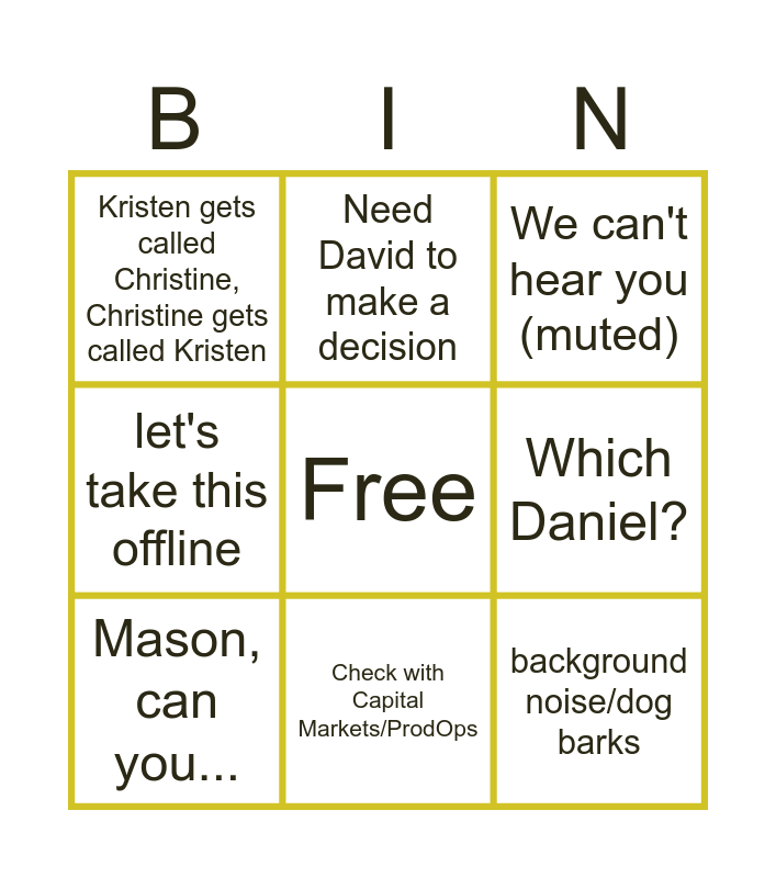This bingo card has a free space and 8 words: Which Daniel?, We can't hear you (muted), Need David to make a decision, Mason, can you..., Kristen gets called Christine, Christine gets called Kristen, background noise/dog barks, let's take this offline and Check with Capital Markets/ProdOps.
