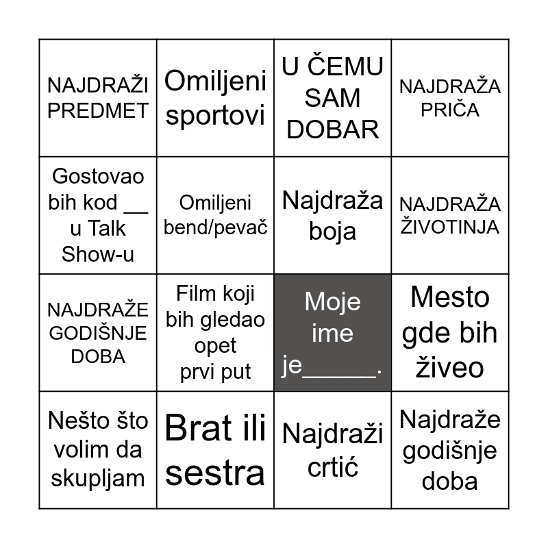 This bingo card has 21 words: Brat ili sestra, Kućni ljubimac, Omiljeni sportovi, Omiljeno jelo, Najdraži crtić, Najdraža boja, NAJDRAŽI PREDMET, U ČEMU SAM DOBAR, Moje ime je_____., NAJDRAŽA ŽIVOTINJA, NAJDRAŽE GODIŠNJE DOBA, NAJDRAŽA PRIČA, Najdraže godišnje doba, Rad od kuće ili kancelarije, Omiljeni bend/pevač, Hobi koji želim da naučim, Nešto što volim da skupljam, Film koji bih gledao opet prvi put, Gostovao bih kod __ u Talk Show-u, Mesto gde bih živeo and Nešto na čemu sam zahvalan.