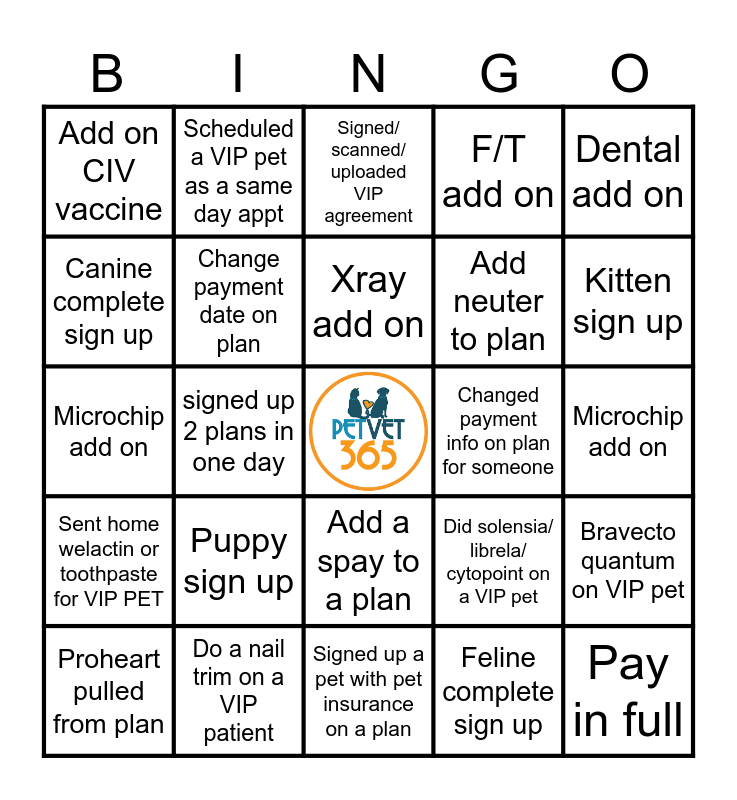 This bingo card has a free space and 24 words: Puppy sign up, Do a nail trim on a VIP patient, Xray add on, Proheart pulled from plan, Dental add on, Add on CIV vaccine, Canine complete sign up, Scheduled a VIP pet as a same day appt, Changed payment info on plan for someone, Add a spay to a plan, Add neuter to plan, Microchip add on, Did solensia/ librela/ cytopoint on a VIP pet, Bravecto quantum on VIP pet, Change payment date on plan, Feline complete sign up, Microchip add on, Signed/ scanned/ uploaded VIP agreement, Kitten sign up, signed up 2 plans in one day, Pay in full, Sent home welactin or toothpaste for VIP PET, F/T add on and Signed up a pet with pet insurance on a plan.
