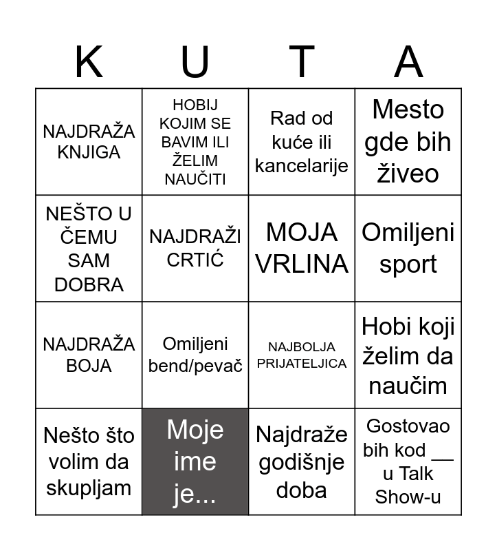 This bingo card has 25 words: Brat ili sestra, Kućni ljubimac, Omiljeni sport, NAJDRAŽE MJESTO, NEŠTO U ČEMU SAM DOBRA, NAJDRAŽA KNJIGA, NAJDRAŽI CRTIĆ, HOBIJ KOJIM SE BAVIM ILI ŽELIM NAUČITI, Moje ime je..., OMILJENA HRANA, NAJDRAŽA BOJA, NAJBOLJA PRIJATELJICA, OMILJENA ŽIVOTINJA, NAJDRAŽI PREDMET, MOJA VRLINA, Najdraže godišnje doba, Najdraže godišnje doba, Rad od kuće ili kancelarije, Omiljeni bend/pevač, Hobi koji želim da naučim, Nešto što volim da skupljam, Film koji bih gledao opet prvi put, Gostovao bih kod __ u Talk Show-u, Mesto gde bih živeo and Nešto na čemu sam zahvalan.