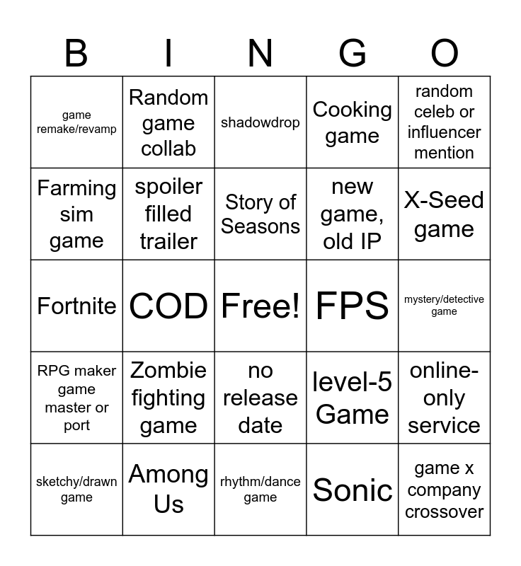 This bingo card has a free space and 30 words: Among Us, Pixel-art game, COD, game merch, game remake/revamp, shadowdrop, spoiler filled trailer, no release date, FPS, rhythm/dance game, mystery/detective game, game x company crossover, Sonic, Rune factory, X-Seed game, delayed game drop, level-5 Game, RPG maker game master or port, Zombie fighting game, random celeb or influencer mention, Fortnite, fighting game, Random game collab, new game, old IP, Farming sim game, Cooking game, online-only service, sketchy/drawn game, Story of Seasons and Metal Gear.