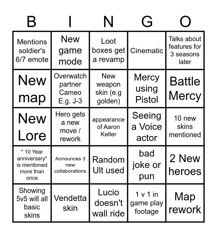 This bingo card has a free space and 24 words: Announces 3 new collaborations, Vendetta skin, New weapon skin (e.g golden), Showing 5v5 will all basic skins, Talks about features for 3 seasons later, Mentions soldier's 6/7 emote, New map, New game mode, Seeing a Voice actor, Random Ult used, Mercy using Pistol, New Lore, bad joke or pun, 2 New heroes, Overwatch partner Cameo E.g. J-3, 1 v 1 in game play footage, 10 new skins mentioned, Loot boxes get a revamp, Battle Mercy, Hero gets a new move / rework, Map rework, " 10 Year anniversary" is mentioned more than once, Cinematic and Lucio doesn't wall ride.