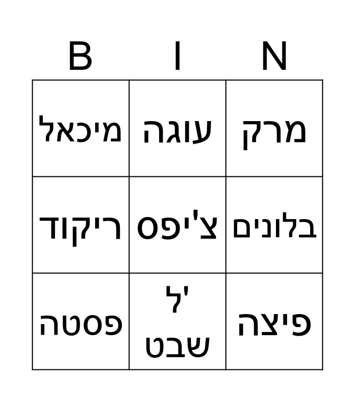 This bingo card has 18 words: 8, ב'2, מרק, מיכאל, חנה, ריקוד, כדורסל, עוגה, ל' שבט, פיצה, נעמי, צ'יפס, אבישג, בלונים, פסטה, ציור, בישול and קופטיאב.