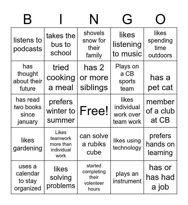 This bingo card has a free space and 24 words: Likes teamwork more than individual work, likes solving problems, has 2 or more siblings, uses a calendar to stay organized, likes spending time outdoors, listens to podcasts, has thought about their future, takes the bus to school, likes individual work over team work, can solve a rubiks cube, Plays on a CB sports team, has read two books since january, likes using technology, prefers hands on learning, tried cooking a meal, plays an instrument, member of a club at CB, shovels snow for their family, has a pet cat, prefers winter to summer, has or has had a job, likes gardening, likes listening to music and started completing their volenteer hours.