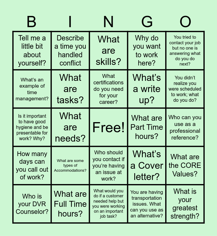 This bingo card has a free space and 29 words: Who is your DVR Counselor?, What are wants?, What are needs?, What is Gross vs. Net pay?, Tell me a little bit about yourself?, What are skills?, What are tasks?, What are some types of Accommodations?, What are Part Time hours?, What are Full Time hours?, Who can you use as a professional reference?, What is your greatest strength?, What would you do if a customer needed help but you were working on an important job task?, You are having transportation issues. What can you use as an alternative?, You didn’t realize you were scheduled to work; what do you do?, What is advocating?, Who should you contact if you’re having an issue at work?, How many days can you call out of work?, You tried to contact your job but no one is answering what do you do next?, Is it important to have good hygiene and be presentable for work? Why?, What’s a Cover letter?, What’s on your Resume?, What’s a write up?, What’s an example of time management?, Why do you want to work here?, Describe a time you handled conflict, What are the CORE Values?, What certifications do you need for your career? and What are the managers names?.