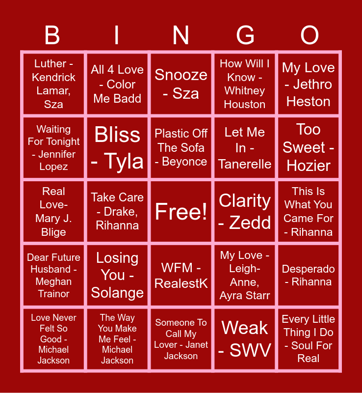 This bingo card has a free space and 129 words: Adore You - Harry Styles, All 4 Love - Color Me Badd, All For You - Janet Jackson, Amor Prohibido - Selena, ART - Tyla, Birds Of A Feather - Billie Eilish, Candle Flame - Jungle, Candy Rain - Soul For Real, Clarity - Zedd, Desperado - Rihanna, Die For You - The Weeknd, Disease - Lady Gaga, Dreams - Dua Lipa, Electricty - Dua Lipa, Fantasy - Mariah Carey, Gonna Love Me - Teyana Taylor, Greedy - Ariana Grande, I Feel It Coming - The Weeknd, If It's Lovin' That You Want - Rihanna, Just For Me - Saint Jhn, Late Night Talking - Harry Styles, Losing You - Solange, Less Than Zero - The Weeknd, Latch - Disclosure, Love On Top - Beyonce, PYT - Michael Jackson, Rock With You - Michael Jackson, Safety Net - Ariana Grande, Ty Dolla $ign, Save Room For Us - Tinashe, Truth Or Dare - Tyla, Waiting For Tonight - Jennifer Lopez, The Way You Make Me Feel - Michael Jackson, WFM - RealestK, My Love - Leigh-Anne, Ayra Starr, Her - Majid Jordan, How Deep Is Your Love - Calvin Harris, More Than A Woman - Aaliyah, Rock The Boat - Aaliyah, 1 Thing - Amerie, Heartbreaker - Mariah Carey, Jay-Z, Real Love- Mary J. Blige, Can We Talk - Tevin Campbell, II Hands II Heaven - Beyonce, I'm Your Baby Tonight - Whitney Houston, Adore You - Nao, We Found Love - Rihanna, One Thing - One Direction, Plastic Off The Sofa - Beyonce, Virgo's Groove - Beyonce, This Is What You Came For - Rihanna, All I Have - Jennifer Lopez, I Want It That Way - Backstreet Boys, Why Don't We Fall In Love - Amerie, Cater 2 U - Destiny's Child, My Love - Justin Timberlake, All Me - Kehlani, Keyshia Cole, That's What I Like - Bruno Mars, Kiss It Better - Rihanna, Happy - Nao, I'm Still In Love With You - Sean Paul, Man I Need - Olivia Dean, Love Me Not - Ravyn Lenae, Dreaming Of You - Selena, Peaches - Justin Bieber, You - Lloud, Lil' Wayne, Luther - Kendrick Lamar, Sza, Best Of My Love - The Emotions, Brooklyn Love - Lolo Zouai, Let Me In - Tanerelle, My Love - Jethro Heston, Never Too Much - Luther Vandross, Think About You - Tiana Major9, With Every Heartbeat - Robyn, XO - Beyonce, You And I - Lady Gaga, Everyone Falls In Love - Tanto Metro, Streets - Doja Cat, Love Language - Ariana Grande, Obsession - Frankie J, Me & U - Cassie, Love Never Felt So Good - Michael Jackson, Take Care - Drake, Rihanna, Adorn - Miguel, Thinkin Bout You - Frank Ocean, Too Sweet - Hozier, Bad Habit - Steve Lacy, Telepatia - Kali Uchis, Back To You - Selena Gomez, My My My! - Troye Sivan, Come On Over Baby - Christina Aguilera, Up At Night - Kehlani, Justin Bieber, One Kiss - Dula Peep , Calvin Harris, Someone To Call My Lover - Janet Jackson, A Thousand Miles - Vanessa Carlton, Every Little Thing I Do - Soul For Real, I Wanna Dance With Somebody - Whitney Houston, Honey - Mariah Carey, Snooze - Sza, How Will I Know - Whitney Houston, No One - Alicia Keys, Ghost - Justin Bieber, Bliss - Tyla, La Modelo - Ozuna, Cardi B, Chanel - Tyla, Stay - Zedd, Alessia Cara, Dear Future Husband - Meghan Trainor, The One That Got Away - Katy Perry, LOVEHAPPY - The Carters, Moonlight - Kali Uchis, Let Me Love You - Mario, Best Part - Daniel Caesar, HER, I Just Might - Bruno Mars, So Easy (To Fall In Love) - Olivia Dean, Emotions - Mariah Carey, Find Your Love - Drake, Deja Vu - Beyonce, Jay-Z, Want U Back - Cher Lloyd, Call Me Maybe - Carly Rae Jepsen, Training Season - Dula Peep, Happy - Ashanti, Love - Keyshia Cole, Chemicals React - Aly & AJ, Scared Of Lonely - Beyonce, Weak - SWV, The Subway - Chappel Roan, Sugar Talking - Sabrina Carpenter, Silky - Madeline Lauer, I Like It - Debarge and Got To Be Real - Cheryl Lynn.