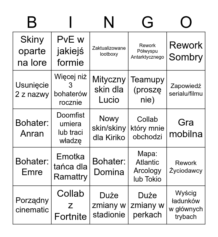 This bingo card has a free space and 24 words: Emotka tańca dla Ramattry, Collab z Fortnite, Mityczny skin dla Lucio, Porządny cinematic, Rework Sombry, Skiny oparte na lore, Usunięcie 2 z nazwy, PvE w jakiejś formie, Collab który mnie obchodzi, Bohater: Domina, Teamupy (proszę nie), Bohater: Anran, Mapa: Atlantic Arcology lub Tokio, Rework Życiodawcy, Więcej niż 3 bohaterów rocznie, Duże zmiany w perkach, Gra mobilna, Zaktualizowane lootboxy, Zapowiedź serialu/filmu, Doomfist umiera lub traci władzę, Wyścig ładunków w głównych trybach, Bohater: Emre, Rework Półwyspu Antarktycznego and Duże zmiany w stadionie.