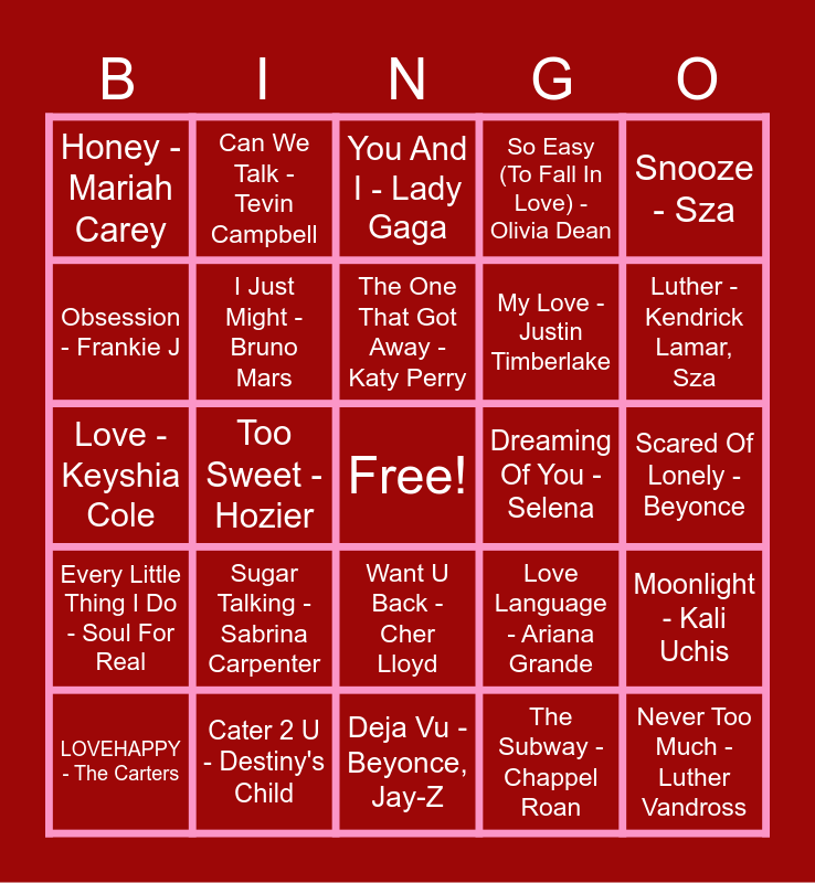 This bingo card has a free space and 97 words: Take Care - Drake, Rihanna, Adorn - Miguel, Thinkin Bout You - Frank Ocean, Too Sweet - Hozier, Bad Habit - Steve Lacy, Telepatia - Kali Uchis, Back To You - Selena Gomez, My My My! - Troye Sivan, Come On Over Baby - Christina Aguilera, Up At Night - Kehlani, Justin Bieber, One Kiss - Dula Peep , Calvin Harris, Someone To Call My Lover - Janet Jackson, A Thousand Miles - Vanessa Carlton, Every Little Thing I Do - Soul For Real, I Wanna Dance With Somebody - Whitney Houston, Honey - Mariah Carey, Snooze - Sza, How Will I Know - Whitney Houston, No One - Alicia Keys, Ghost - Justin Bieber, Bliss - Tyla, La Modelo - Ozuna, Cardi B, Chanel - Tyla, Stay - Zedd, Alessia Cara, Dear Future Husband - Meghan Trainor, The One That Got Away - Katy Perry, LOVEHAPPY - The Carters, Moonlight - Kali Uchis, Let Me Love You - Mario, Best Part - Daniel Caesar, HER, I Just Might - Bruno Mars, So Easy (To Fall In Love) - Olivia Dean, Emotions - Mariah Carey, Find Your Love - Drake, Deja Vu - Beyonce, Jay-Z, Want U Back - Cher Lloyd, Call Me Maybe - Carly Rae Jepsen, Training Season - Dula Peep, Happy - Ashanti, Love - Keyshia Cole, Chemicals React - Aly & AJ, Scared Of Lonely - Beyonce, Weak - SWV, The Subway - Chappel Roan, Sugar Talking - Sabrina Carpenter, Silky - Madeline Lauer, I Like It - Debarge, Got To Be Real - Cheryl Lynn, WFM - RealestK, My Love - Leigh-Anne, Ayra Starr, Her - Majid Jordan, How Deep Is Your Love - Calvin Harris, More Than A Woman - Aaliyah, Rock The Boat - Aaliyah, 1 Thing - Amerie, Heartbreaker - Mariah Carey, Jay-Z, Real Love- Mary J. Blige, Can We Talk - Tevin Campbell, II Hands II Heaven - Beyonce, I'm Your Baby Tonight - Whitney Houston, Adore You - Nao, We Found Love - Rihanna, One Thing - One Direction, Plastic Off The Sofa - Beyonce, Virgo's Groove - Beyonce, This Is What You Came For - Rihanna, All I Have - Jennifer Lopez, I Want It That Way - Backstreet Boys, Why Don't We Fall In Love - Amerie, Cater 2 U - Destiny's Child, My Love - Justin Timberlake, All Me - Kehlani, Keyshia Cole, That's What I Like - Bruno Mars, Kiss It Better - Rihanna, Happy - Nao, I'm Still In Love With You - Sean Paul, Man I Need - Olivia Dean, Love Me Not - Ravyn Lenae, Dreaming Of You - Selena, Peaches - Justin Bieber, You - Lloud, Lil' Wayne, Luther - Kendrick Lamar, Sza, Best Of My Love - The Emotions, Brooklyn Love - Lolo Zouai, Let Me In - Tanerelle, My Love - Jethro Heston, Never Too Much - Luther Vandross, Think About You - Tiana Major9, With Every Heartbeat - Robyn, XO - Beyonce, You And I - Lady Gaga, Everyone Falls In Love - Tanto Metro, Streets - Doja Cat, Love Language - Ariana Grande, Obsession - Frankie J, Me & U - Cassie and Love Never Felt So Good - Michael Jackson.