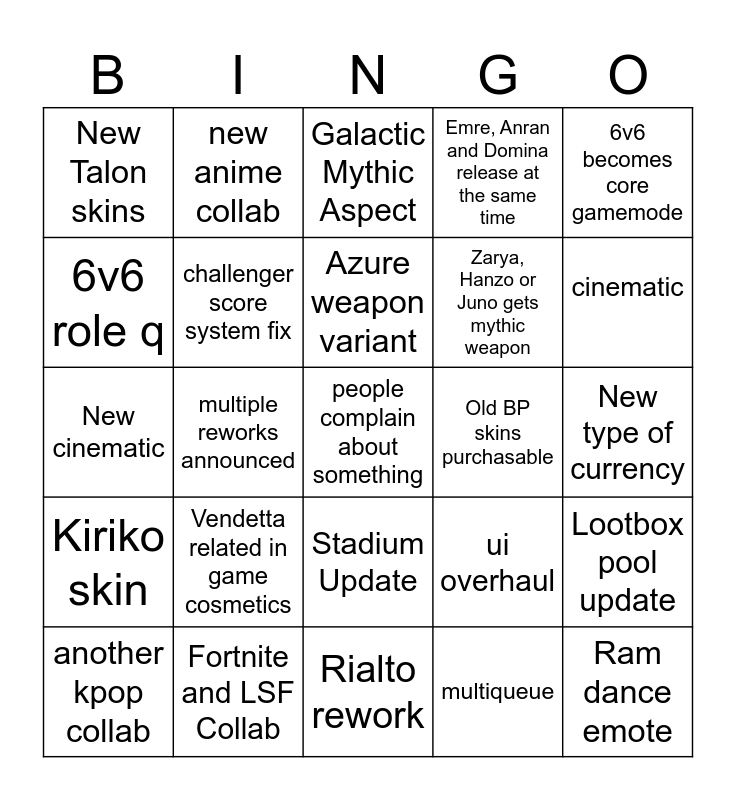 This bingo card has a free space and 41 words: Perk changes, New cinematic, Lucio mythic skin, challenger score system fix, Fortnite and LSF Collab, Stadium Update, Azure weapon variant, 2 in OW2 removed, 6v6 becomes core gamemode, Kiriko skin, multiple reworks announced, Emre, Anran and Domina release at the same time, Ram dance emote, New type of currency, Old BP skins purchasable, Vendetta related in game cosmetics, Teamups, New Talon skins, Progression system adjustments, Galactic Mythic Aspect, Lootbox pool update, New Core Maps Announced, Rialto rework, Zarya, Hanzo or Juno gets mythic weapon, new PVE, passives removed, multiqueue, end of game cards, cinematic, s9 reversal, 3+ new mythics at the same time, new anime collab, another kpop collab, ow mobile, ui overhaul, 6v6 role q, 2cp returns, new lootbox pool, selectable main menu, clash reworked /readded and doomfist dies.