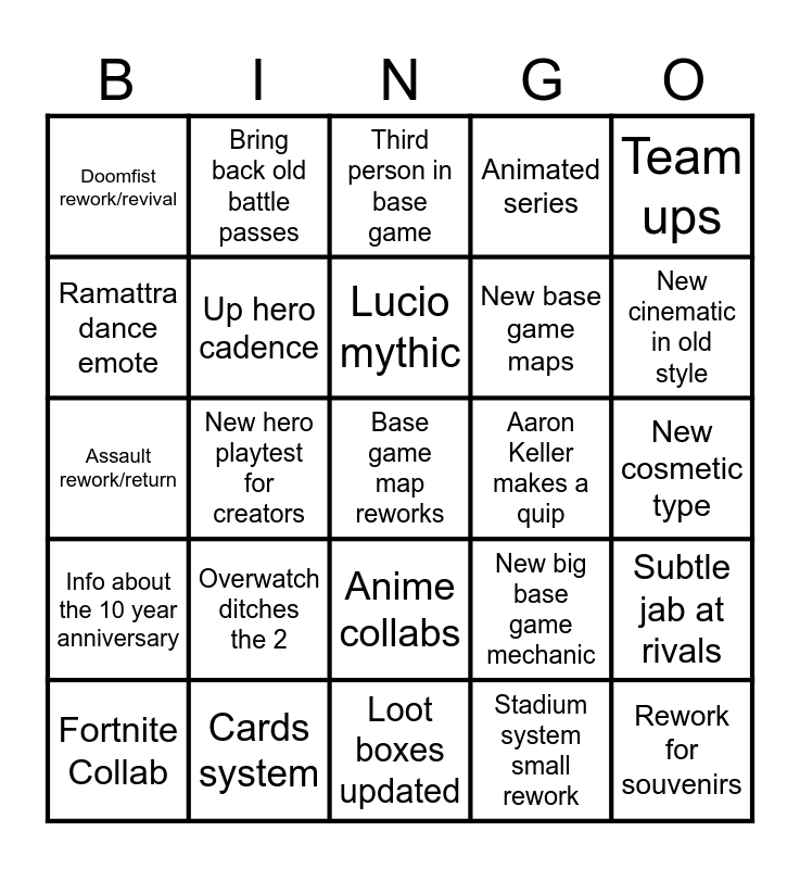 This bingo card has 25 words: Overwatch ditches the 2, Loot boxes updated, Lucio mythic, Fortnite Collab, Team ups, Doomfist rework/revival, Ramattra dance emote, Bring back old battle passes, Aaron Keller makes a quip, Anime collabs, New base game maps, Assault rework/return, New big base game mechanic, Subtle jab at rivals, Up hero cadence, Rework for souvenirs, New cosmetic type, Third person in base game, New cinematic in old style, New hero playtest for creators, Base game map reworks, Cards system, Info about the 10 year anniversary, Animated series and Stadium system small rework.
