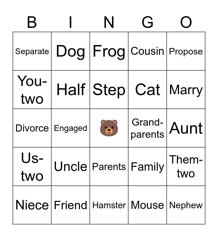 This bingo card has a free space and 24 words: Uncle, Friend, Step, Niece, Propose, Separate, You-two, Dog, Grand- parents, Parents, Cat, Divorce, Family, Them-two, Half, Mouse, Aunt, Frog, Marry, Engaged, Nephew, Us-two, Cousin and Hamster.