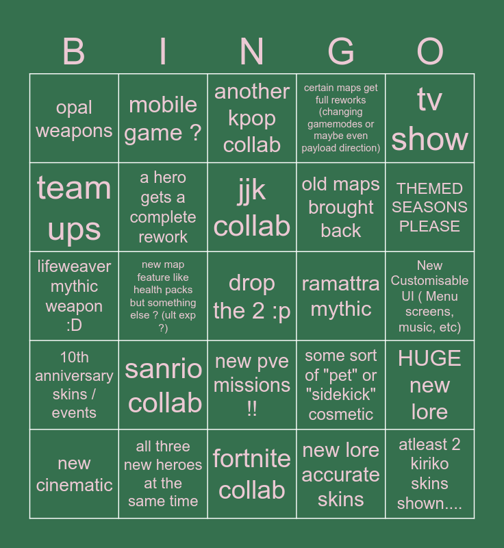 This bingo card has a free space and 24 words: sanrio collab, all three new heroes at the same time, jjk collab, new cinematic, tv show, opal weapons, team ups, mobile game ?, ramattra mythic, new pve missions !!, old maps brought back, lifeweaver mythic weapon :D, some sort of "pet" or "sidekick" cosmetic, HUGE new lore, a hero gets a complete rework, new lore accurate skins, New Customisable UI ( Menu screens, music, etc), another kpop collab, THEMED SEASONS PLEASE, new map feature like health packs but something else ? (ult exp ?), atleast 2 kiriko skins shown...., 10th anniversary skins / events, certain maps get full reworks (changing gamemodes or maybe even payload direction) and fortnite collab.