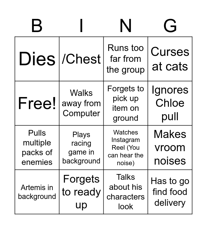 This bingo card has 16 words: Forgets to ready up, Makes vroom noises, Runs too far from the group, Dies, Pulls multiple packs of enemies, /Chest, Watches Instagram Reel (You can hear the noise), Talks about his characters look, Free!, Walks away from Computer, Artemis in background, Curses at cats, Plays racing game in background, Ignores Chloe pull, Forgets to pick up item on ground and Has to go find food delivery.