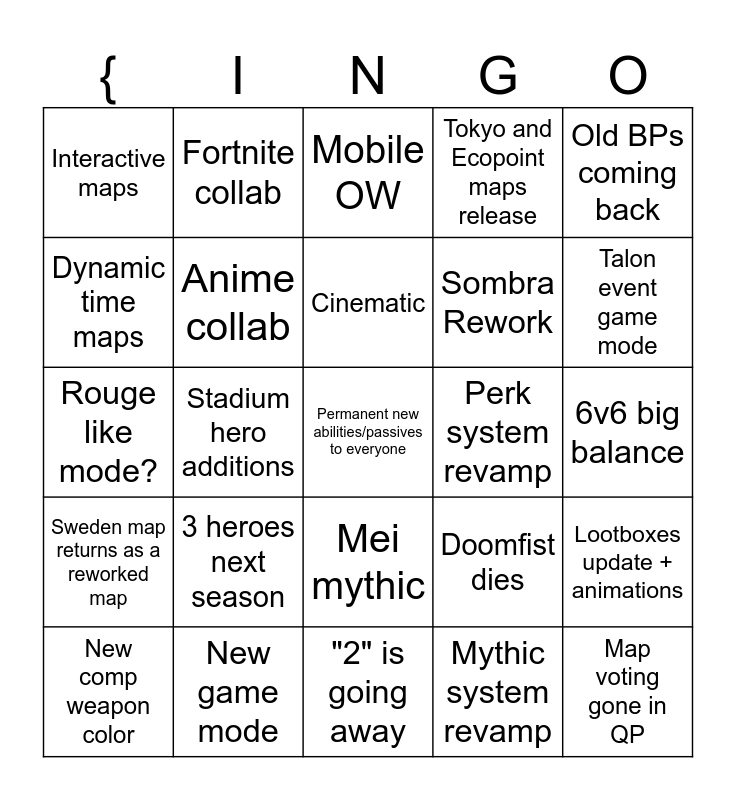 This bingo card has 25 words: 3 heroes next season, "2" is going away, Cinematic, New comp weapon color, Old BPs coming back, Interactive maps, Dynamic time maps, Fortnite collab, Perk system revamp, Mei mythic, Sombra Rework, Rouge like mode?, Doomfist dies, Lootboxes update + animations, Anime collab, Map voting gone in QP, 6v6 big balance, Mobile OW, Talon event game mode, Stadium hero additions, Permanent new abilities/passives to everyone, New game mode, Sweden map returns as a reworked map, Tokyo and Ecopoint maps release and Mythic system revamp.