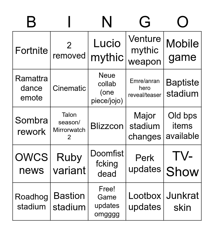 This bingo card has 25 words: OWCS news, Bastion stadium, Blizzcon, Lootbox updates, Mobile game, Fortnite, 2 removed, Lucio mythic, Major stadium changes, TV-Show, Ramattra dance emote, Cinematic, Free! Game updates omgggg, Perk updates, Baptiste stadium, Roadhog stadium, Talon season/ Mirrorwatch 2, Neue collab (one piece/jojo), Emre/anran hero reveal/teaser, Old bps items available, Sombra rework, Ruby variant, Doomfist fcking dead, Venture mythic weapon and Junkrat skin.