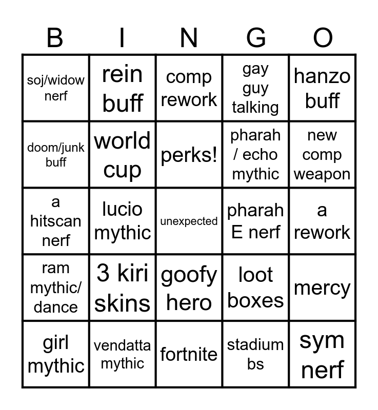 This bingo card has a free space and 24 words: 3 kiri skins, vendatta mythic, perks!, girl mythic, hanzo buff, soj/widow nerf, doom/junk buff, rein buff, pharah E nerf, goofy hero, pharah / echo mythic, a hitscan nerf, loot boxes, mercy, world cup, stadium bs, a rework, comp rework, new comp weapon, lucio mythic, sym nerf, ram mythic/ dance, gay guy talking and fortnite.