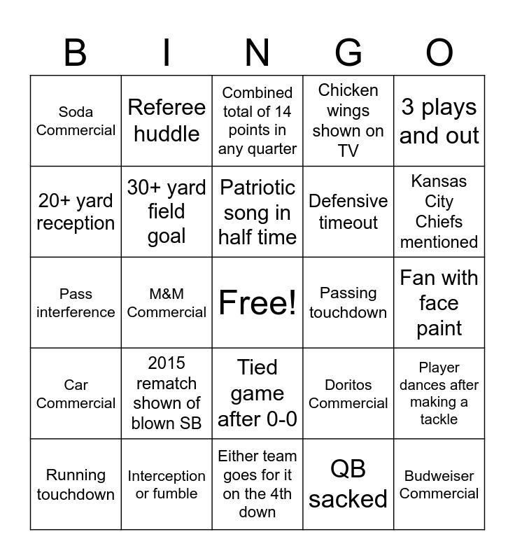 This bingo card has a free space and 29 words: Running touchdown, Injured player, M&M Commercial, Fans “boo” ref call, Soda Commercial, Combined total of 14 points in any quarter, 30+ yard field goal, 2015 rematch shown of blown SB, Passing touchdown, Interception or fumble, Fan with face paint, Budweiser Commercial, Either team goes for it on the 4th down, QB sacked, Kansas City Chiefs mentioned, Coach yells at ref, Tied game after 0-0, Car Commercial, 3 plays and out, Pass interference, Doritos Commercial, Celebrity sighting in crowd, Defensive timeout, 20+ yard reception, Chicken wings shown on TV, Referee huddle, Player dances after making a tackle, Patriotic song in half time and Police officer shown.