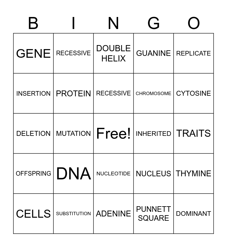 This bingo card has a free space and 24 words: DNA, SUBSTITUTION, RECESSIVE, CELLS, REPLICATE, GENE, INSERTION, RECESSIVE, INHERITED, NUCLEOTIDE, CHROMOSOME, DELETION, NUCLEUS, THYMINE, PROTEIN, PUNNETT SQUARE, TRAITS, DOUBLE HELIX, CYTOSINE, MUTATION, DOMINANT, OFFSPRING, GUANINE and ADENINE.