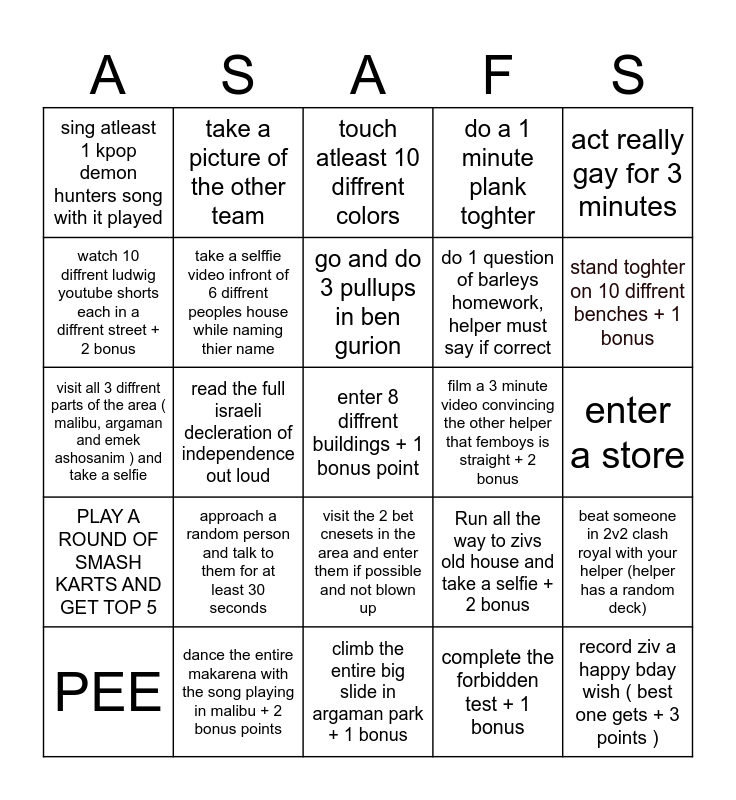 This bingo card has 25 words: approach a random person and talk to them for at least 30 seconds, climb the entire big slide in argaman park + 1 bonus, go and do 3 pullups in ben gurion, PEE, act really gay for 3 minutes, sing atleast 1 kpop demon hunters song with it played, watch 10 diffrent ludwig youtube shorts each in a diffrent street + 2 bonus, take a picture of the other team, film a 3 minute video convincing the other helper that femboys is straight + 2 bonus, visit the 2 bet cnesets in the area and enter them if possible and not blown up, do 1 question of barleys homework, helper must say if correct, visit all 3 diffrent parts of the area ( malibu, argaman and emek ashosanim ) and take a selfie, Run all the way to zivs old house and take a selfie + 2 bonus, beat someone in 2v2 clash royal with your helper (helper has a random deck), take a selffie video infront of 6 diffrent peoples house while naming thier name, record ziv a happy bday wish ( best one gets + 3 points ), enter a store, touch atleast 10 diffrent colors, stand toghter on 10 diffrent benches + 1 bonus, read the full israeli decleration of independence out loud, enter 8 diffrent buildings + 1 bonus point, dance the entire makarena with the song playing in malibu + 2 bonus points, PLAY A ROUND OF SMASH KARTS AND GET TOP 5, do a 1 minute plank toghter and complete the forbidden test + 1 bonus.