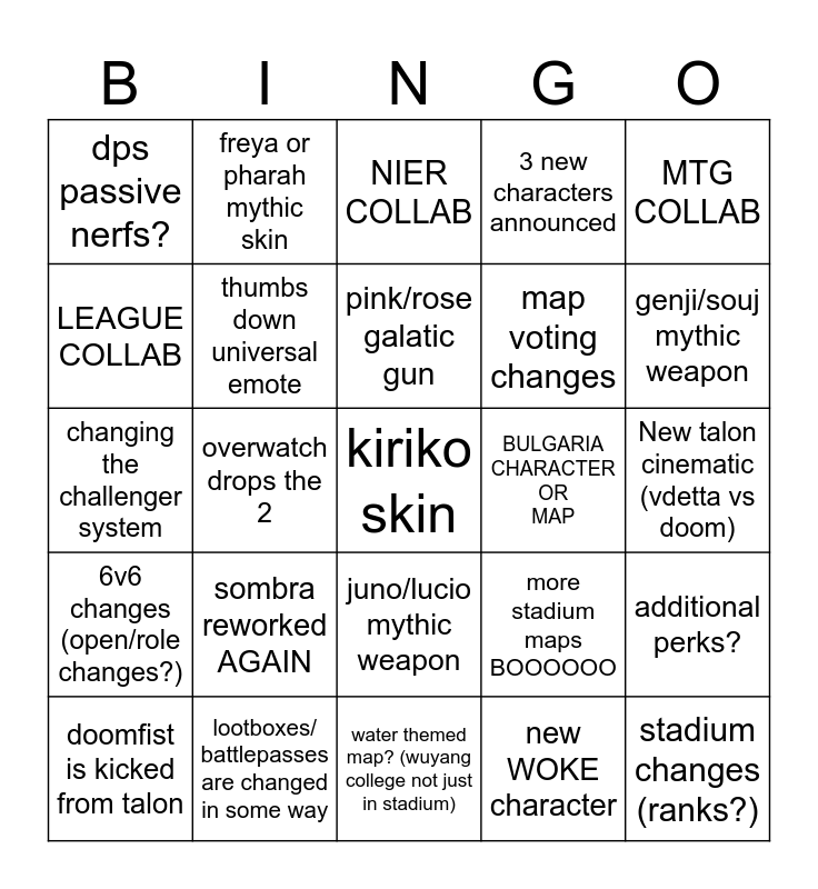 This bingo card has a free space and 24 words: sombra reworked AGAIN, lootboxes/ battlepasses are changed in some way, pink/rose galatic gun, doomfist is kicked from talon, MTG COLLAB, dps passive nerfs?, LEAGUE COLLAB, freya or pharah mythic skin, BULGARIA CHARACTER OR MAP, juno/lucio mythic weapon, map voting changes, changing the challenger system, more stadium maps BOOOOOO, additional perks?, thumbs down universal emote, new WOKE character, New talon cinematic (vdetta vs doom), NIER COLLAB, genji/souj mythic weapon, overwatch drops the 2, stadium changes (ranks?), 6v6 changes (open/role changes?), 3 new characters announced and water themed map? (wuyang college not just in stadium).