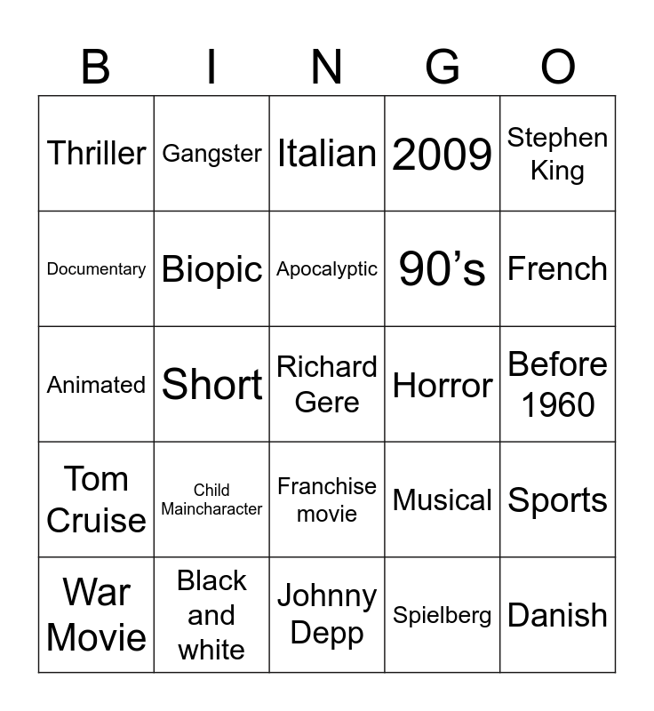 This bingo card has a free space and 24 words: War Movie, Child Maincharacter, Apocalyptic, Spielberg, Stephen King, Thriller, Gangster, Italian, Horror, Before 1960, Animated, Biopic, Musical, Sports, Documentary, Black and white, Johnny Depp, 2009, French, Tom Cruise, Short, Franchise movie, 90’s and Danish.