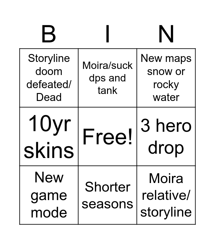 This bingo card has a free space and 8 words: 3 hero drop, New maps snow or rocky water, Moira/suck dps and tank, New game mode, Storyline doom defeated/ Dead, Moira relative/ storyline, 10yr skins and Shorter seasons.