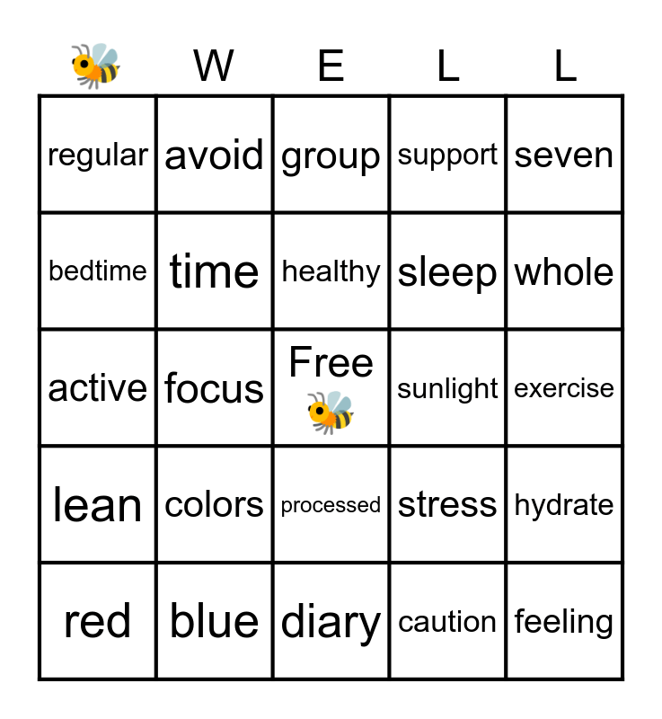 This bingo card has a free space and 24 words: colors, blue, healthy, red, seven, regular, bedtime, avoid, sunlight, processed, sleep, active, stress, hydrate, time, caution, exercise, group, whole, focus, feeling, lean, support and diary.