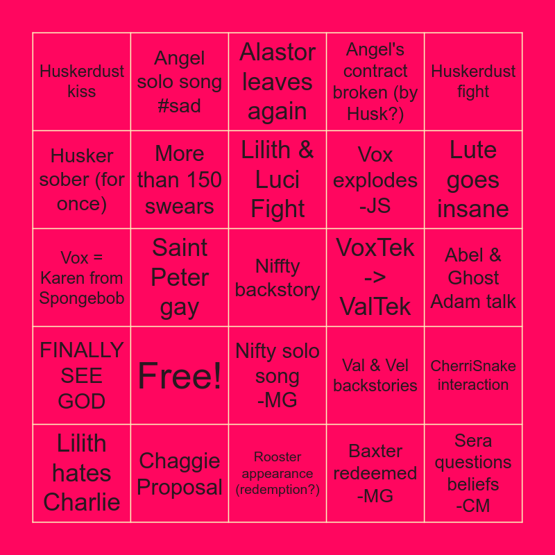 This bingo card has a free space and 24 words: Free!, Chaggie Proposal, Lilith & Luci Fight, Lilith hates Charlie, Huskerdust fight, Huskerdust kiss, Husker sober (for once), Angel solo song #sad, VoxTek -> ValTek, Nifty solo song -MG, Vox explodes -JS, Vox = Karen from Spongebob, Val & Vel backstories, CherriSnake interaction, More than 150 swears, Baxter redeemed -MG, Abel & Ghost Adam talk, Alastor leaves again, Lute goes insane, Saint Peter gay, Sera questions beliefs -CM, FINALLY SEE GOD, Angel's contract broken (by Husk?) and Rooster appearance (redemption?).