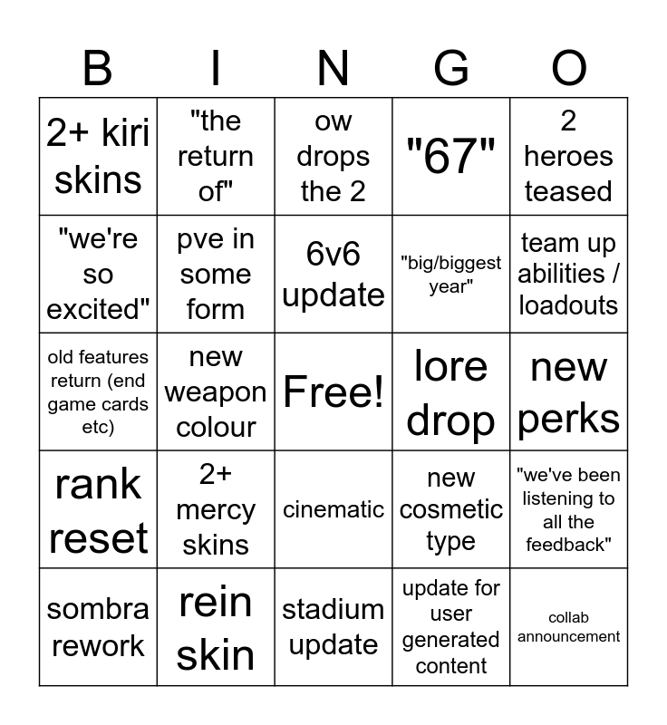 This bingo card has a free space and 29 words: sombra rework, new gamemode, new weapon colour, new map, 2+ kiri skins, ow drops the 2, pve in some form, 2+ mercy skins, lore drop, rein skin, new perks, collab announcement, stadium update, update for user generated content, team up abilities / loadouts, "jetpack cat", cinematic, rank reset, 2 heroes teased, old features return (end game cards etc), new cosmetic type, "new era", "big/biggest year", "we're so excited", "67", "the return of", "we've been listening to all the feedback", 6v6 update and rework anything.