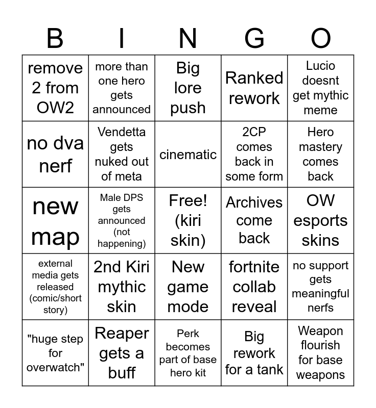 This bingo card has a free space and 24 words: 2nd Kiri mythic skin, Reaper gets a buff, cinematic, "huge step for overwatch", Lucio doesnt get mythic meme, remove 2 from OW2, no dva nerf, more than one hero gets announced, Archives come back, New game mode, 2CP comes back in some form, new map, fortnite collab reveal, no support gets meaningful nerfs, Vendetta gets nuked out of meta, Big rework for a tank, OW esports skins, Big lore push, Hero mastery comes back, Male DPS gets announced (not happening), Weapon flourish for base weapons, external media gets released (comic/short story), Ranked rework and Perk becomes part of base hero kit.