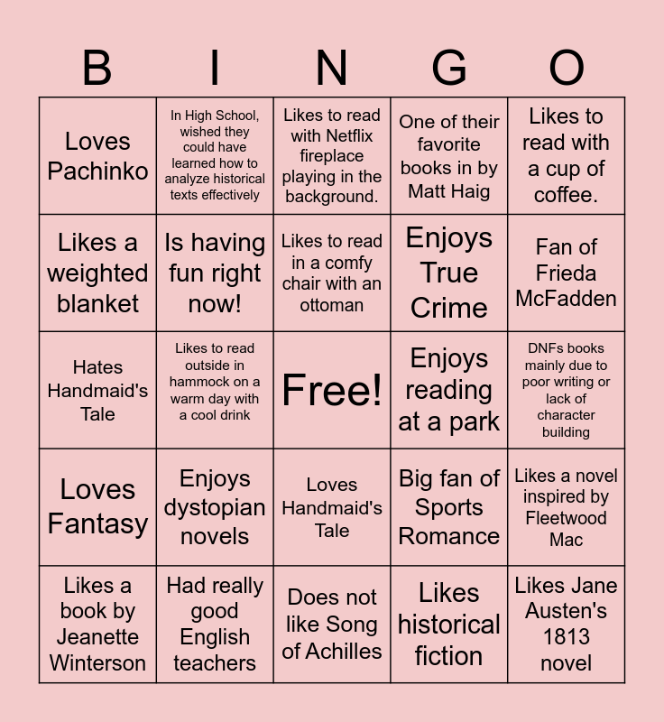 This bingo card has a free space and 24 words: Enjoys dystopian novels, Had really good English teachers, Likes to read in a comfy chair with an ottoman, Likes a book by Jeanette Winterson, Likes to read with a cup of coffee., Loves Pachinko, Likes a weighted blanket, In High School, wished they could have learned how to analyze historical texts effectively, Enjoys reading at a park, Loves Handmaid's Tale, Enjoys True Crime, Hates Handmaid's Tale, Big fan of Sports Romance, Likes a novel inspired by Fleetwood Mac, Is having fun right now!, Likes historical fiction, DNFs books mainly due to poor writing or lack of character building, Likes to read with Netflix fireplace playing in the background., Fan of Frieda McFadden, Likes to read outside in hammock on a warm day with a cool drink, Likes Jane Austen's 1813 novel, Loves Fantasy, One of their favorite books in by Matt Haig and Does not like Song of Achilles.
