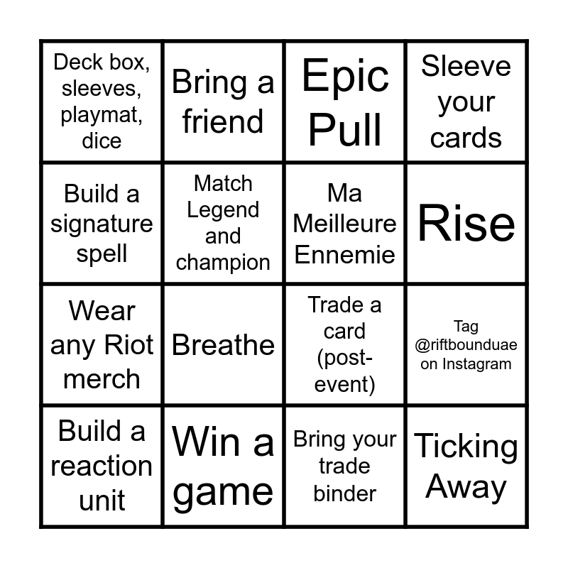 This bingo card has 16 words: Win a game, Tag @riftbounduae on Instagram, Epic Pull, Deck box, sleeves, playmat, dice, Wear any Riot merch, Bring a friend, Trade a card (post-event), Bring your trade binder, Build a signature spell, Match Legend and champion, Build a reaction unit, Sleeve your cards, Breathe, Rise, Ma Meilleure Ennemie and Ticking Away.