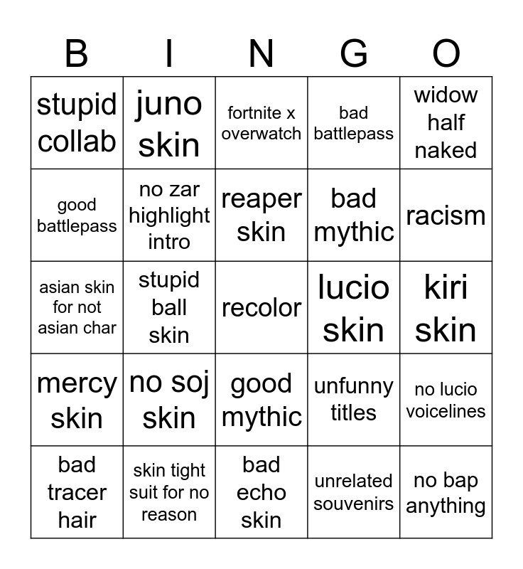 This bingo card has a free space and 24 words: no soj skin, skin tight suit for no reason, reaper skin, bad tracer hair, widow half naked, stupid collab, good battlepass, juno skin, lucio skin, good mythic, bad mythic, asian skin for not asian char, unfunny titles, no lucio voicelines, no zar highlight intro, unrelated souvenirs, kiri skin, fortnite x overwatch, racism, stupid ball skin, no bap anything, mercy skin, bad battlepass and bad echo skin.