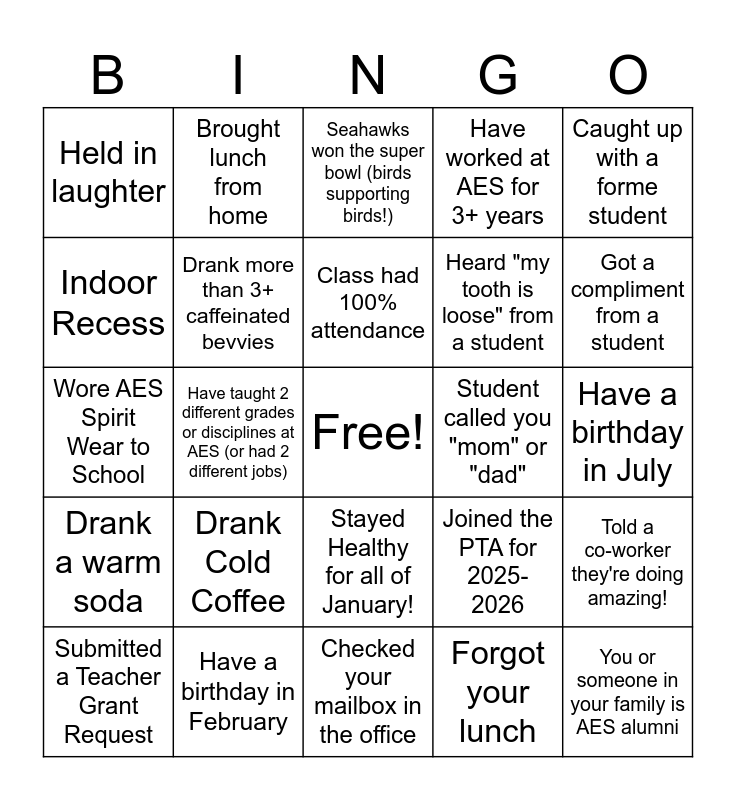 This bingo card has a free space and 24 words: Drank Cold Coffee, Have a birthday in February, Class had 100% attendance, Submitted a Teacher Grant Request, Caught up with a forme student, Held in laughter, Indoor Recess, Brought lunch from home, Student called you "mom" or "dad", Stayed Healthy for all of January!, Heard "my tooth is loose" from a student, Wore AES Spirit Wear to School, Joined the PTA for 2025-2026, Told a co-worker they're doing amazing!, Drank more than 3+ caffeinated bevvies, Forgot your lunch, Have a birthday in July, Seahawks won the super bowl (birds supporting birds!), Got a compliment from a student, Have taught 2 different grades or disciplines at AES (or had 2 different jobs), You or someone in your family is AES alumni, Drank a warm soda, Have worked at AES for 3+ years and Checked your mailbox in the office.