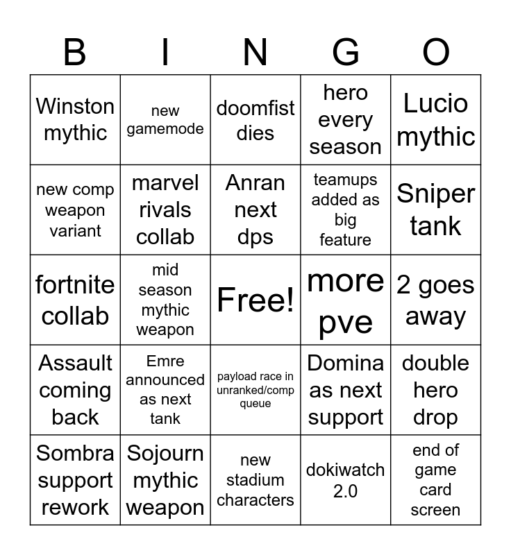 This bingo card has a free space and 24 words: Emre announced as next tank, Sojourn mythic weapon, Anran next dps, Sombra support rework, Lucio mythic, Winston mythic, new comp weapon variant, new gamemode, more pve, payload race in unranked/comp queue, teamups added as big feature, fortnite collab, Domina as next support, double hero drop, marvel rivals collab, dokiwatch 2.0, 2 goes away, doomfist dies, Sniper tank, mid season mythic weapon, end of game card screen, Assault coming back, hero every season and new stadium characters.