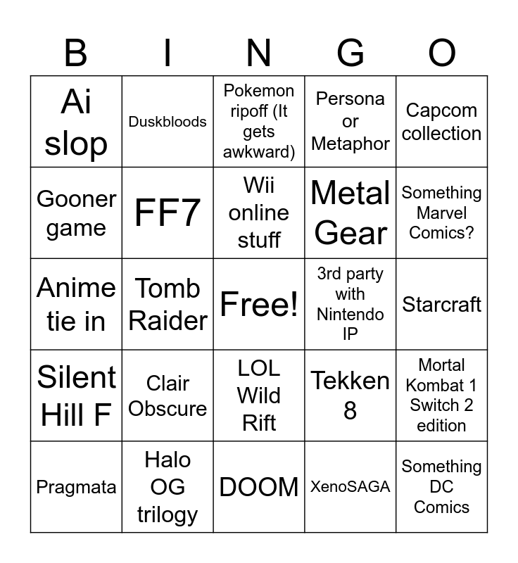 This bingo card has a free space and 24 words: Clair Obscure, Halo OG trilogy, Wii online stuff, Pragmata, Capcom collection, Ai slop, Gooner game, Duskbloods, 3rd party with Nintendo IP, LOL Wild Rift, Metal Gear, Anime tie in, Tekken 8, Mortal Kombat 1 Switch 2 edition, FF7, XenoSAGA, Starcraft, Pokemon ripoff (It gets awkward), Something Marvel Comics?, Tomb Raider, Something DC Comics, Silent Hill F, Persona or Metaphor and DOOM.