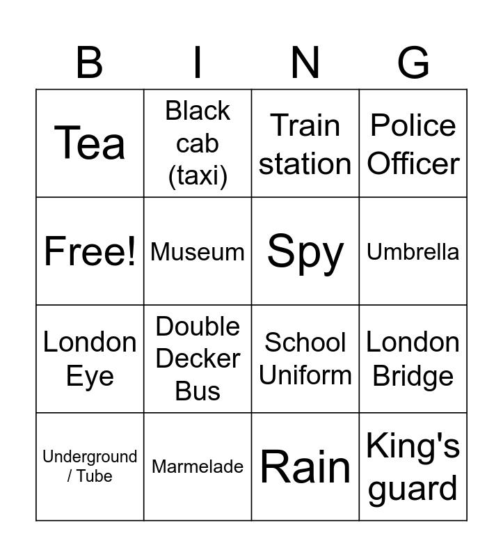 This bingo card has 16 words: Marmelade, London Bridge, Train station, Tea, London Eye, Black cab (taxi), School Uniform, Rain, Free!, Museum, Underground / Tube, Police Officer, Double Decker Bus, Umbrella, Spy and King's guard.