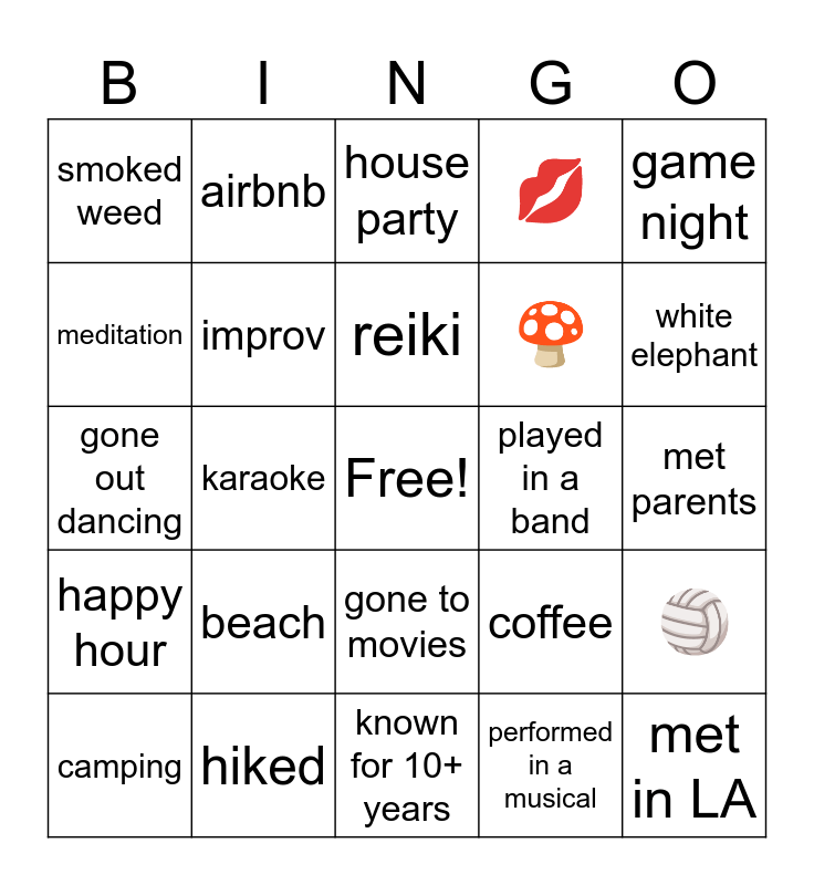This bingo card has a free space and 29 words: camping, malört, karaoke, seen live music, smoked weed, house party, improv, beach, played in a band, hiked, met parents, met in LA, known for 10+ years, performed in a musical, white elephant, ceramics, gone to movies, happy hour, game night, gone out dancing, coffee, yoga, 🍄, meditation, 💋, airbnb, 🏐, reiki and emo/pop punk roots.