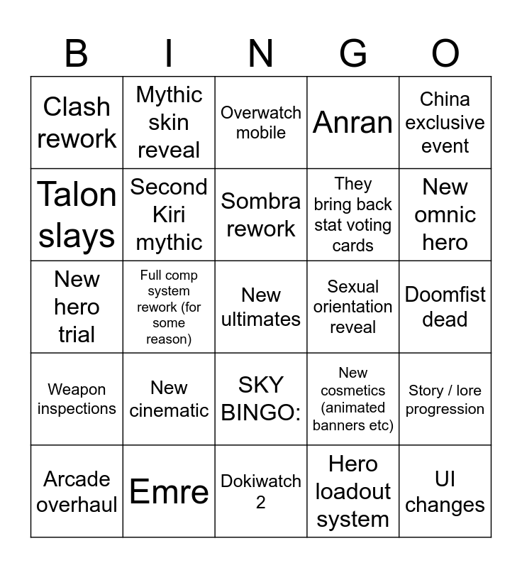 This bingo card has 26 words: SKY BINGO:, Hero loadout system, Sombra rework, Emre, China exclusive event, Clash rework, Talon slays, Mythic skin reveal, Doomfist dead, New cosmetics (animated banners etc), They bring back stat voting cards, New hero trial, Story / lore progression, Arcade overhaul, Full comp system rework (for some reason), Hero swaps between factions, Anran, Weapon inspections, Overwatch mobile, New ultimates, New omnic hero, Dokiwatch 2, Sexual orientation reveal, New cinematic, Second Kiri mythic and UI changes.