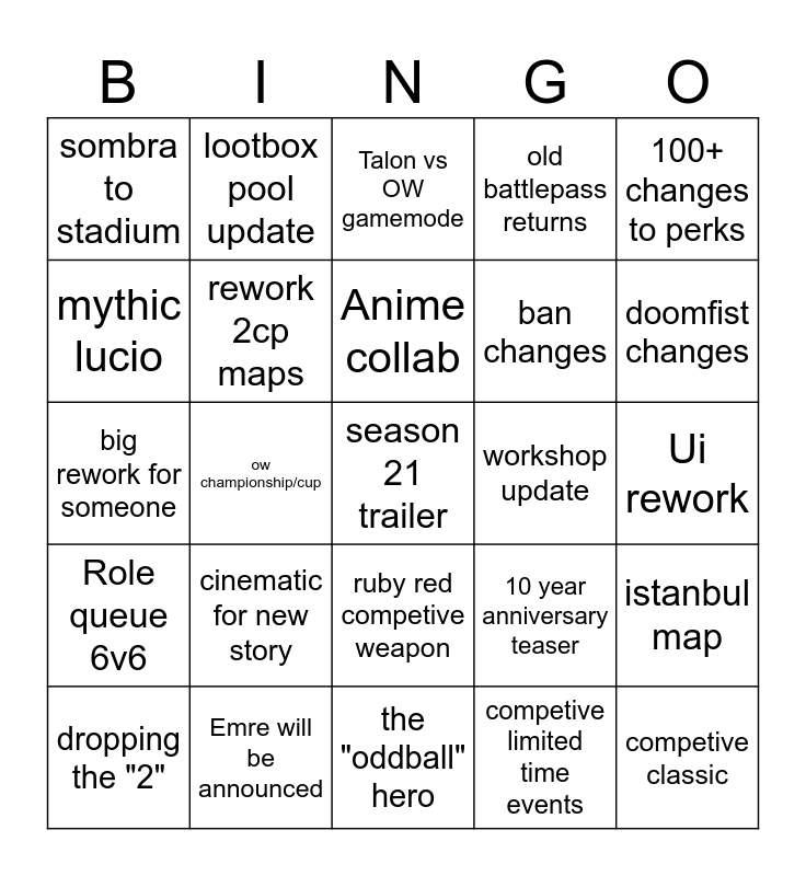 This bingo card has a free space and 24 words: cinematic for new story, Emre will be announced, Anime collab, dropping the "2", 100+ changes to perks, sombra to stadium, mythic lucio, lootbox pool update, workshop update, ruby red competive weapon, ban changes, big rework for someone, 10 year anniversary teaser, istanbul map, rework 2cp maps, competive limited time events, Ui rework, Talon vs OW gamemode, doomfist changes, ow championship/cup, competive classic, Role queue 6v6, old battlepass returns and the "oddball" hero.