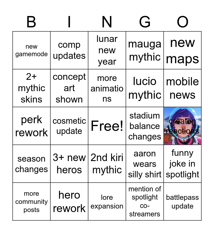 This bingo card has 1 images, a free space and 24 words: 3+ new heros, hero rework, more animatio ns, more community posts, new maps, new gamemode, 2+ mythic skins, comp updates, stadium balance changes, 2nd kiri mythic, lucio mythic, perk rework, aaron wears silly shirt, funny joke in spotlight, concept art shown, mention of spotlight co-streamers, creaton reactions, lunar new year, mobile news, cosmetic update, battlepass update, season changes, mauga mythic and lore expansion.