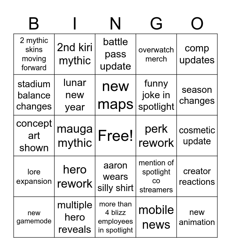 This bingo card has a free space and 24 words: hero rework, multiple hero reveals, new maps, new gamemode, comp updates, 2 mythic skins moving forward, stadium balance changes, 2nd kiri mythic, perk rework, aaron wears silly shirt, funny joke in spotlight, concept art shown, mention of spotlight co streamers, creator reactions, lunar new year, mobile news, cosmetic update, battle pass update, season changes, mauga mythic, new animation, lore expansion, overwatch merch and more than 4 blizz employees in spotlight.