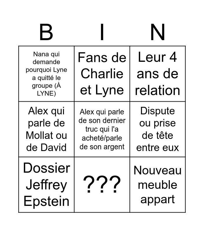 This bingo card has 9 words: Dossier Jeffrey Epstein, Leur 4 ans de relation, Fans de Charlie et Lyne, Alex qui parle de Mollat ou de David, Nana qui demande pourquoi Lyne a quitté le groupe (À LYNE), Dispute ou prise de tête entre eux, Alex qui parle de son dernier truc qui l'a acheté/parle de son argent, Nouveau meuble appart and ???.